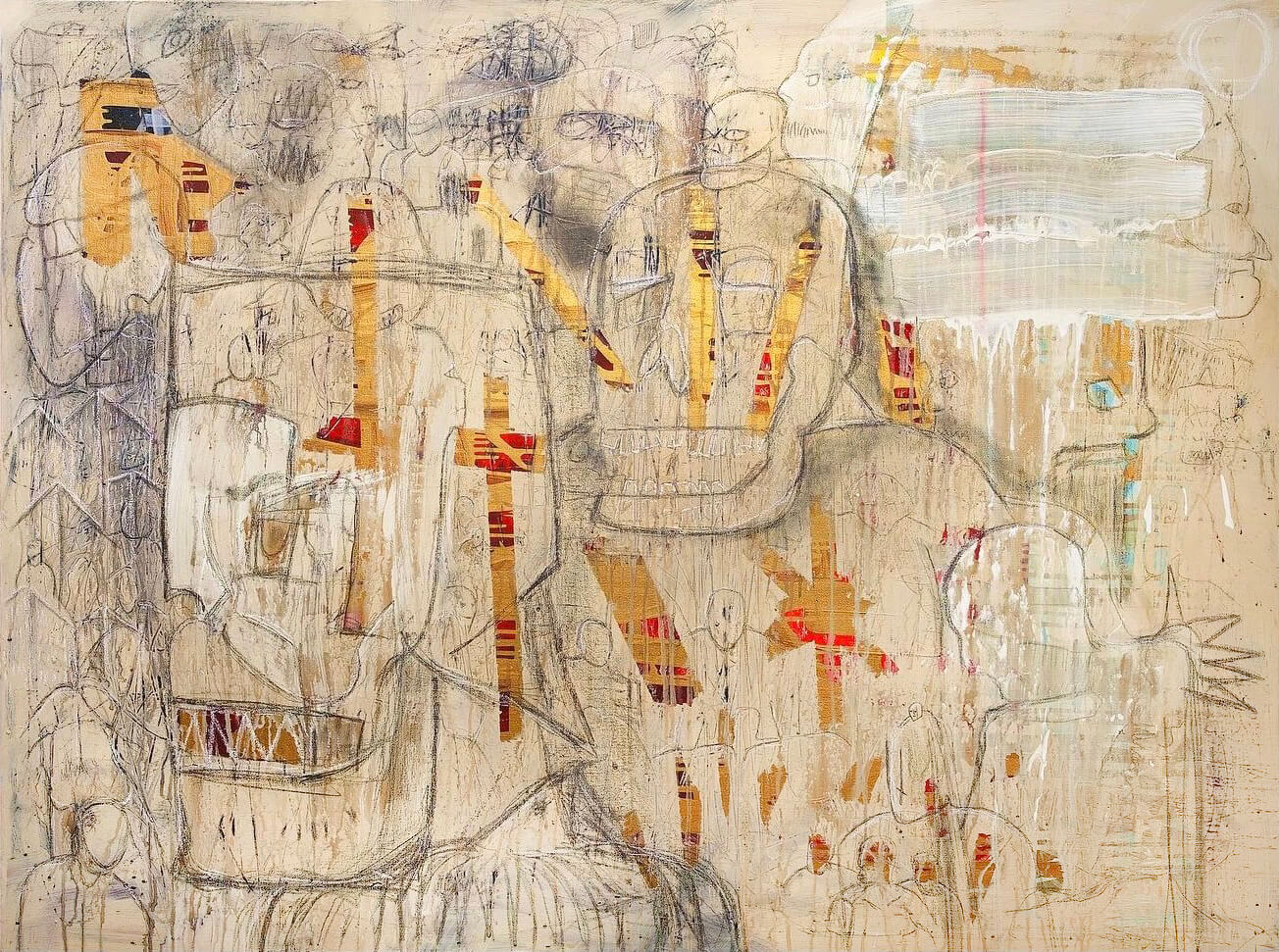 Acrylic, oil, graphite, charcoal, chalk, chalk pastel, metallic ink on canvas