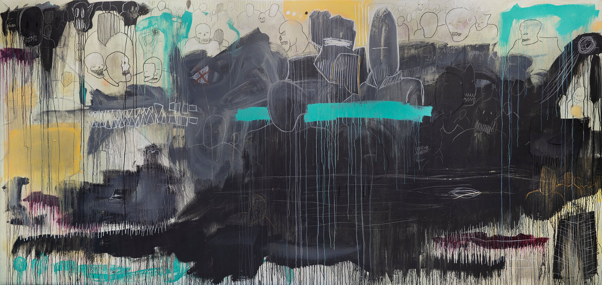 Acrylic, graphite, oilbar, metallic ink on canvas