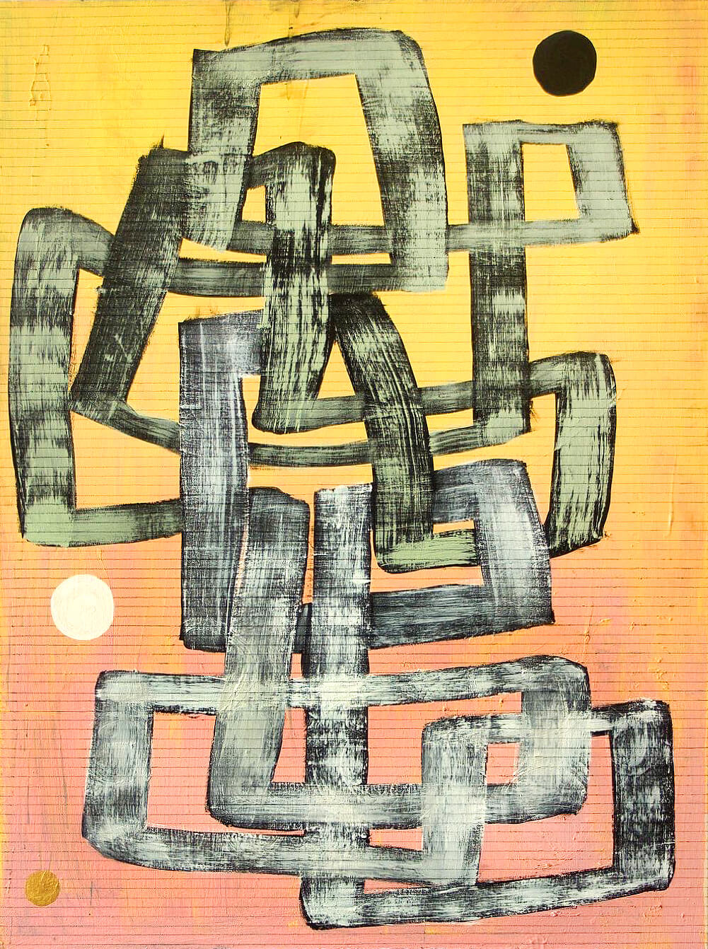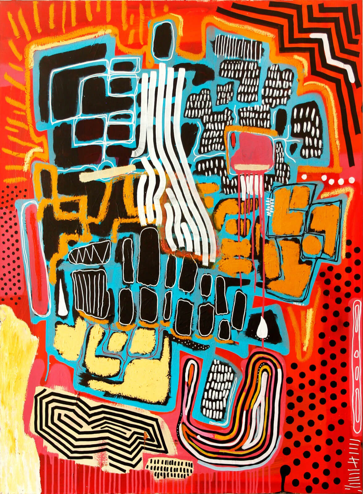 Acrylic, oil bar, graphite, pencil, chalk on canvas